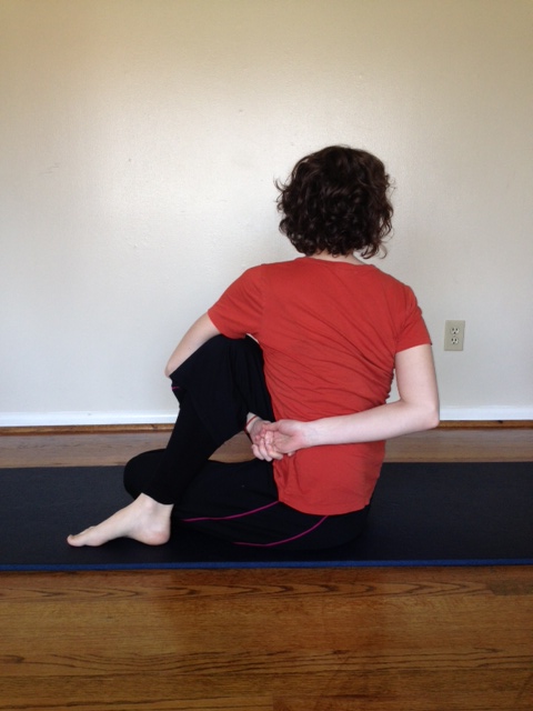 - Sit up tall, bend your right knee and draw your right heel in towards you (Kate is demonstrating the more advanced version with her left leg tucked under her and arms wrapped behind her back).