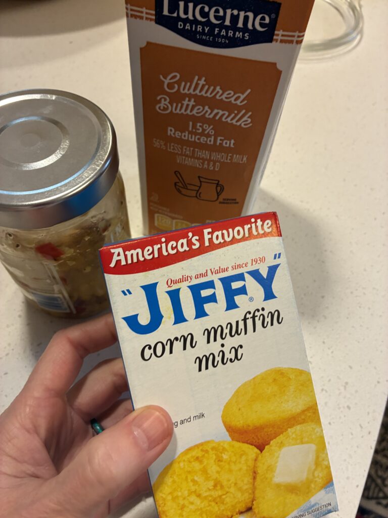 Now here’s the part that’s going to send any foodies into a tizzy, I used a box of Jiffy cornbread mix, added a 1/2 cup of shredded cheese, used buttermilk instead of regular milk and threw in two large spoonfuls of this Trader Joe’s corn salsa.