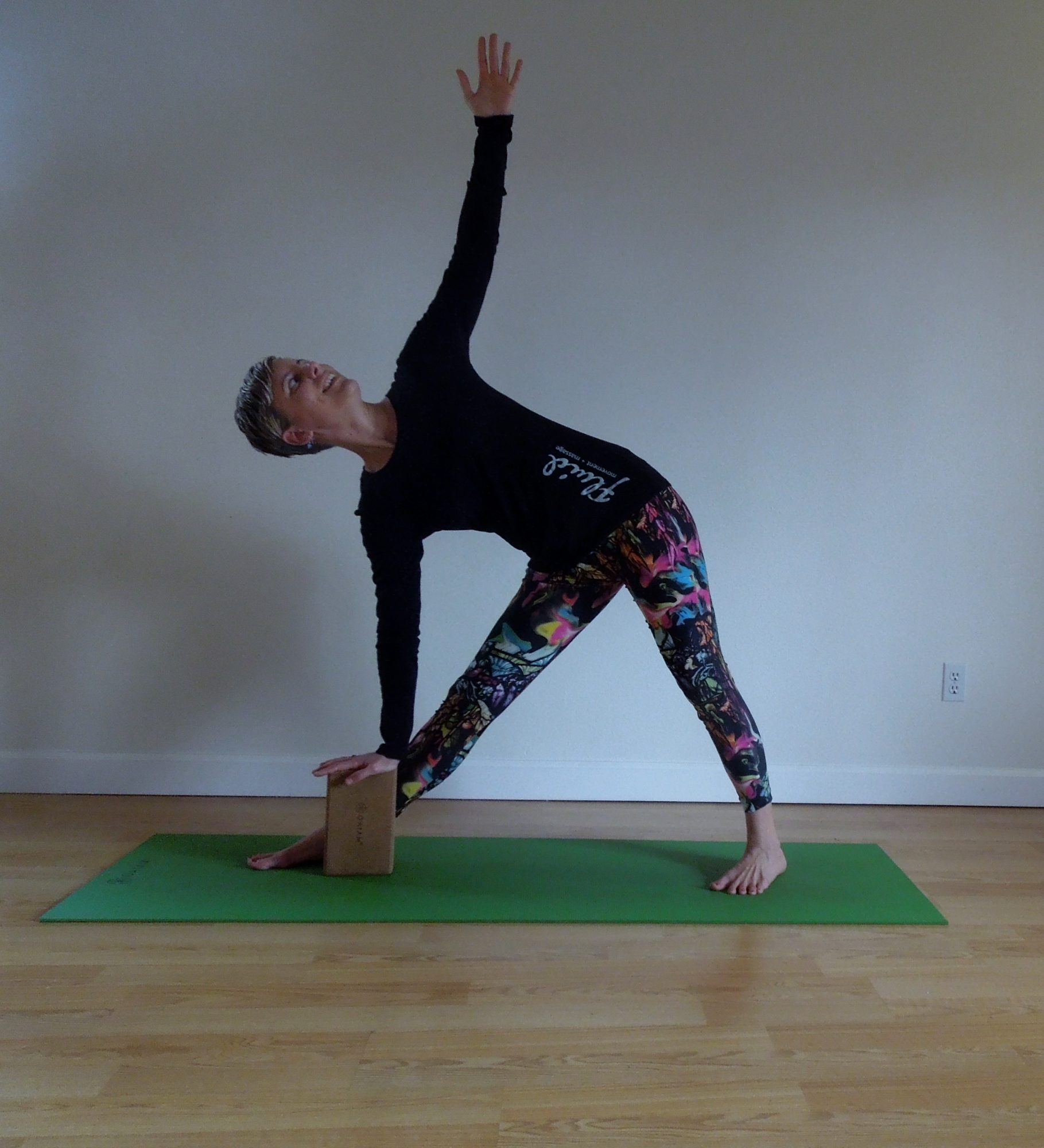 • Reach front arm out as you tilt your torso over your front leg and rest your hand somewhere on your leg or a block. Arms will end up somewhere around 6 and 12 o’clock.