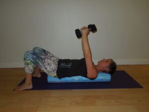 - Bend elbows to bring weights alongside your ears. Keep elbows pointing up to the ceiling (think of a rubber band holding your upper arms in place).
