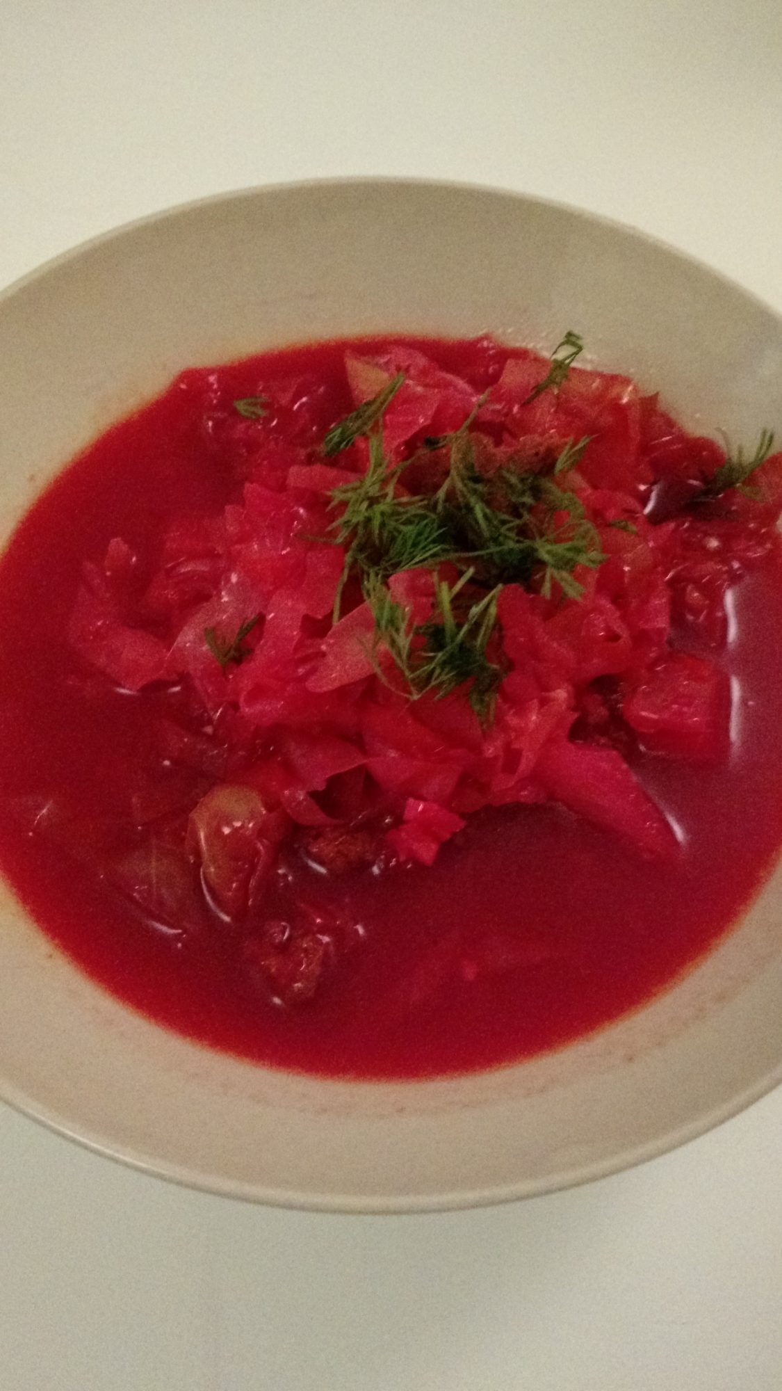 3. In a large skillet saute grated beets with 4 Tbsp olive oil and 1 Tbsp vinegar (5 minutes). Reduce heat to low, add tomato sauce and continue to cook for ten minutes. Carefully stir beets into the soup pot with the meat