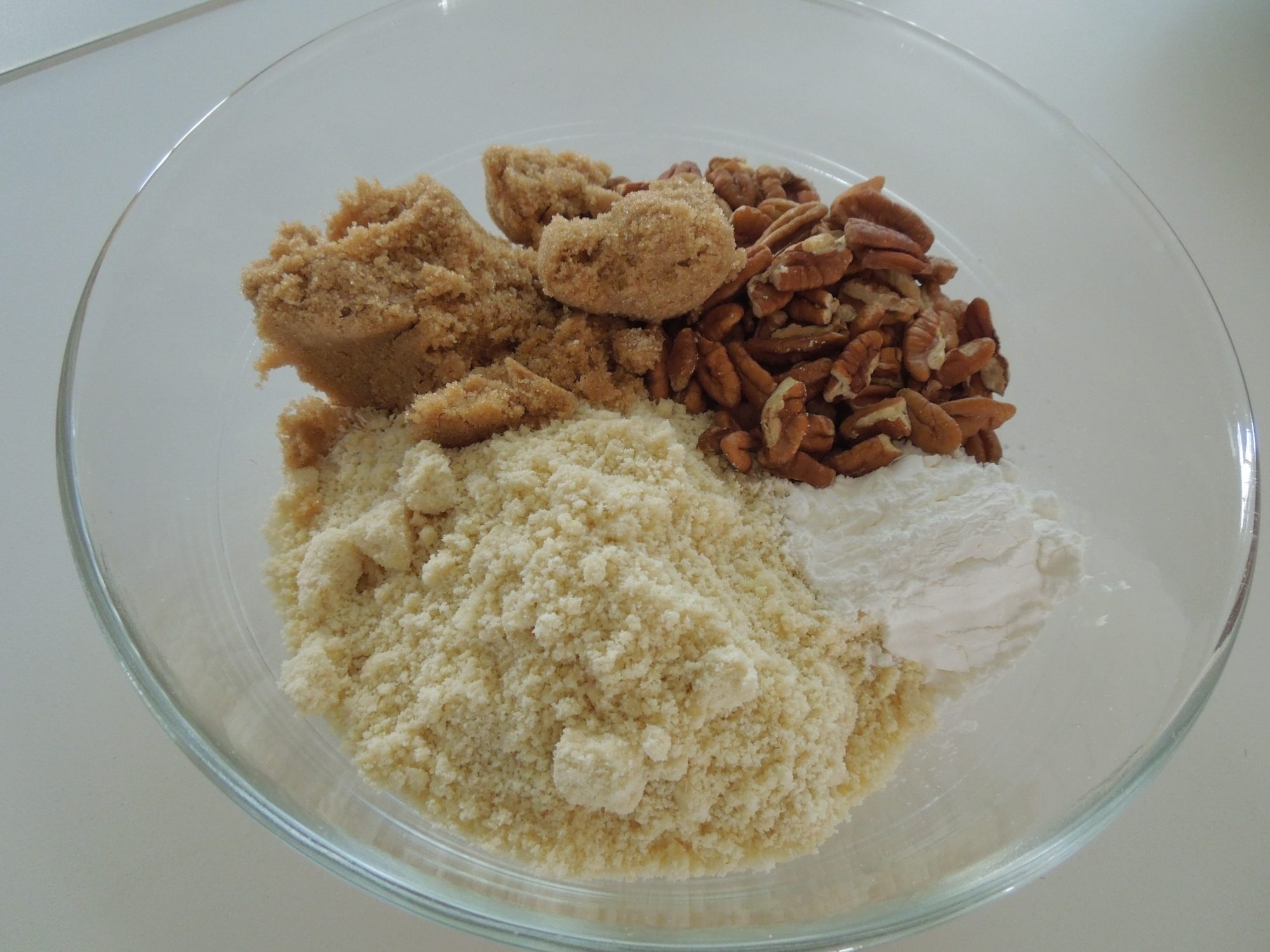 2. Make topping: In a large bowl mix oats, flour, pecans, sugar and salt. Add melted butter and press into small clumps. Put topping in the freezer while you assemble filling.