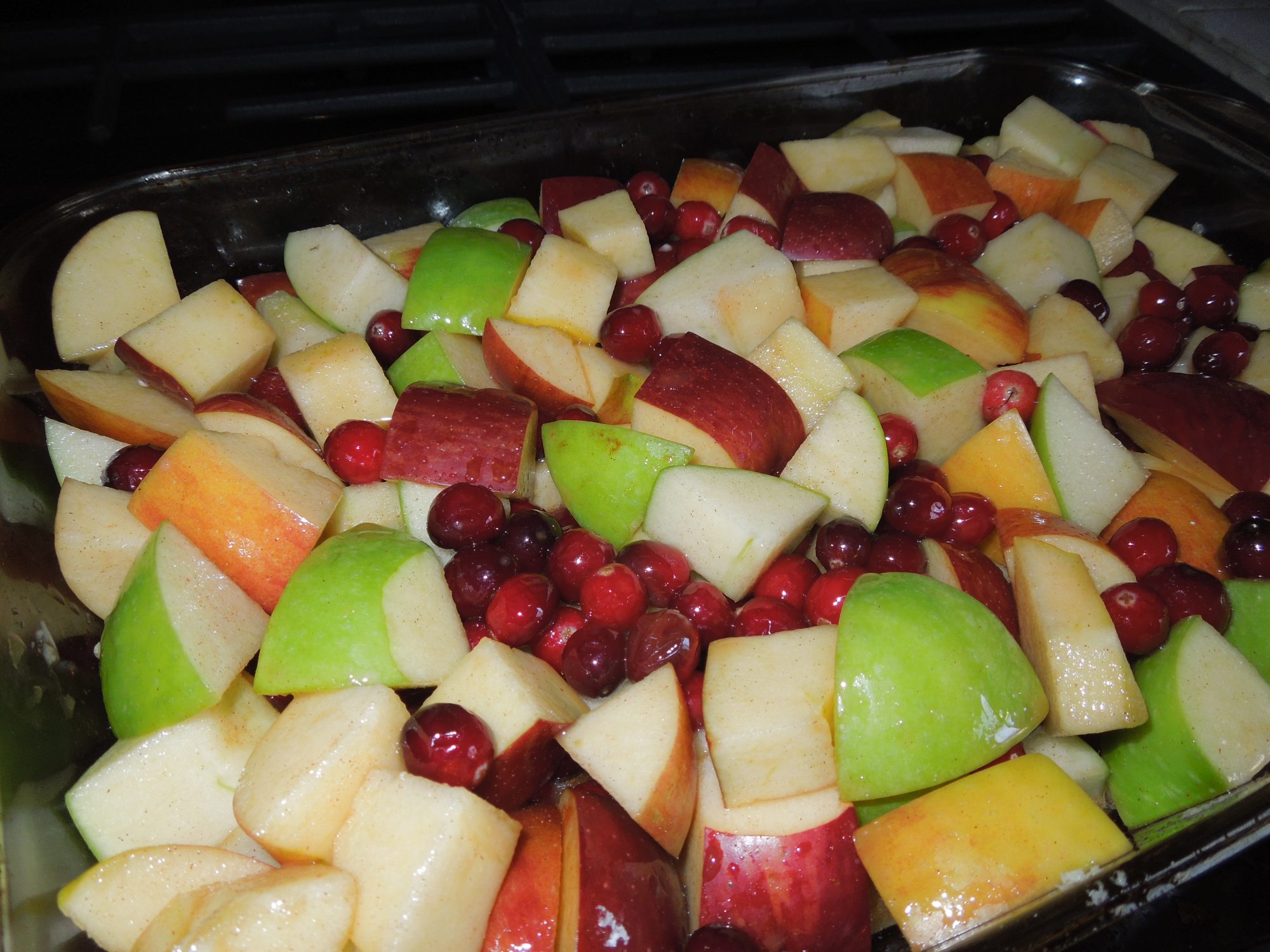 I used a mix of granny smith, red delicious and braeburn apples. Use gluten free oats to make this recipe gluten free. With only 3/4 cup of maple syrup in the filling and 1/2 a cup of brown sugar in the topping the apple and cranberry flavor really comes through and the dish is not overly sweet.