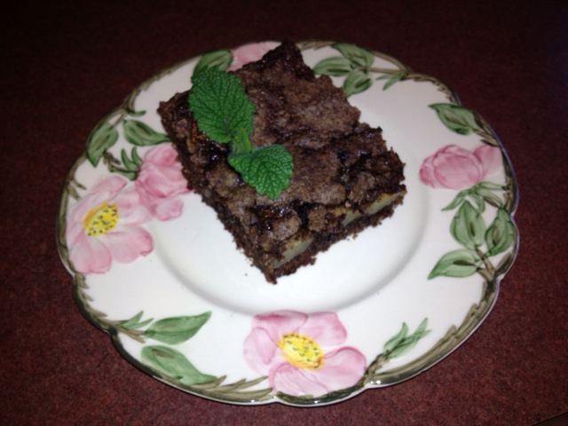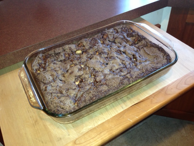 We experimented with sweet vs tart apples and I favored the sweet. The original recipe called for Golden Delicious. The cake has a chewy, brownie like consistency and you really do need to cook it for an hour to get it cooked all the way through. Try this recipe and let me know what you think.
